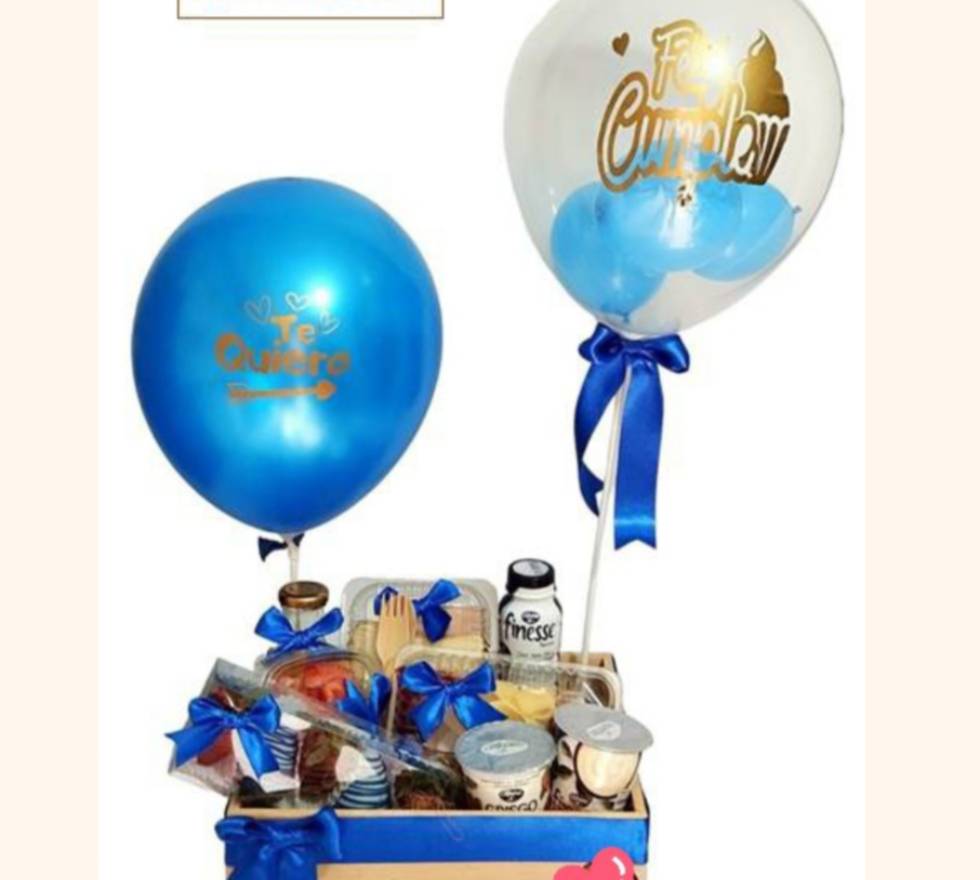 Caja de madera, cinta decorativa, tarjeta, fibra de coco decorativa, globo transparente con globos sencillos por dentro, globo sencillo, sandwich, cubiertos de madera, avena finesse, yogur finesse, yogurt griego, mix de quesos y carnes maduradas, fruta picada, jugo de naranja y caja con 5 fresas cubiertas de chocolate.