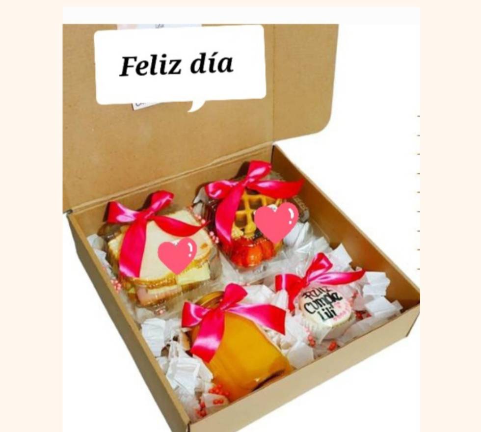 Caja de cartón, cinta decorativa, tarjeta, papel picado, vinilo decorativo, sandwich, pancakes con miel de maple y fresa picada, jugo de naranja y galleta de mantequilla rellena de nutella y maní cubierta de chocolate personalizada.