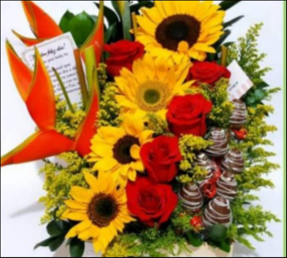 Caja de madera, tarjeta, follaje, aves del paraiso, heliconias, 4 girasoles, 5 rosas, 7 fresas cubiertas con chocolate decoradas y rusco.