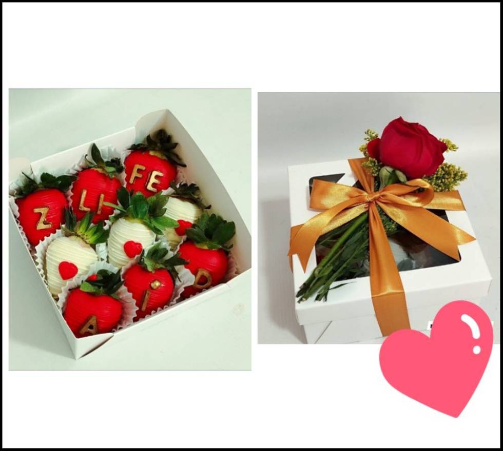 Caja de cartón con tapa en acetato, cinta decorativa, tarjeta, rosa natural con follaje y 9 fresas cubiertas con chocolate decoradas.