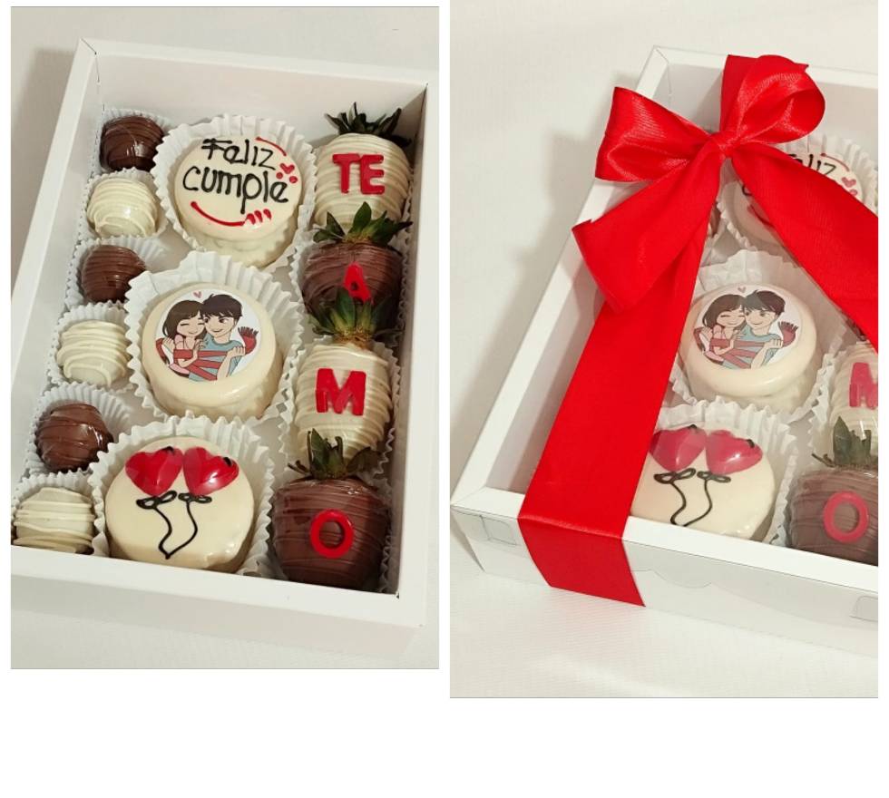 Caja de cartón procesado, cinta decorativa, tarjeta, 3 galletas de mantequilla rellenas de nutella y maní cubiertas de chocolate persaonalizadas, 6 trufas de brownie y 4 fresas cubiertas con chocolate con texto personalizado.