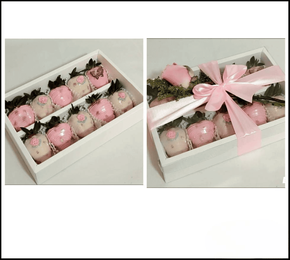 Caja de cartón con tapa en acetato, cinta decorativa, tarjeta y 10 fresas cubiertas con chocolate decoradas.