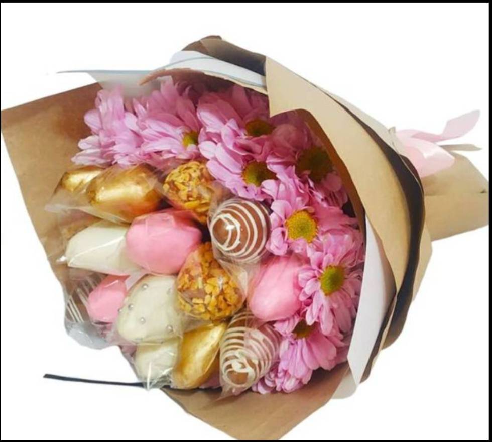 Bouquet de 14 fresas (tipo A) cubiertas con chocolate variadas, flores margarita, empaque en papel kraft y coreano, cinta decorativa y tarjeta.