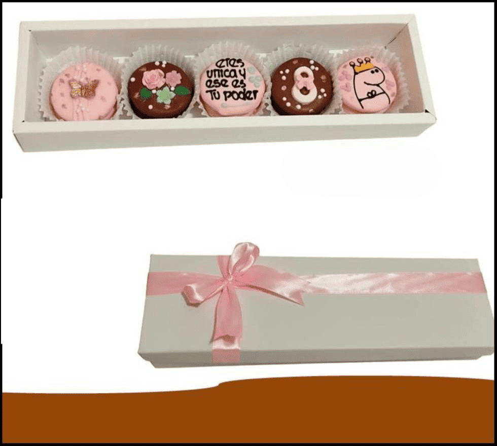 Caja de cartón procesado, cinta decorativa, tarjeta y 5 galletas de mantequilla rellenas de nutella y maní cubiertas de chocolate personalizadas.