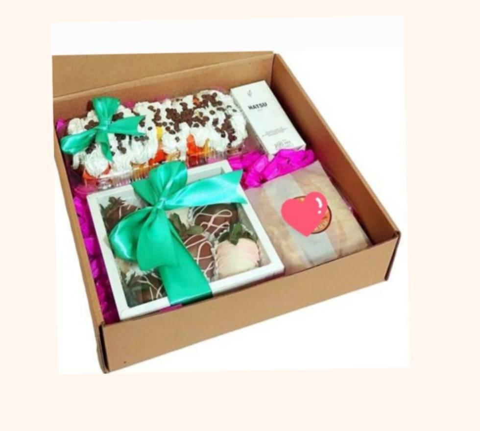 Caja de cartón, papel picado, cinta decorativa, tarjeta, dos globos con helio, ensalada de frutas grande con crema y chips de chocolate, hatsu, 8 fresas cubiertas de chocolate decoradas y sándwich hawaiano con (pan artesanal, queso crema, jamón, lonchita y piña).