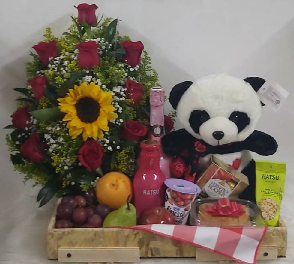 Caja de madera, mantel decorativo, tarjeta, arreglo de rosas y girasoles con follaje, peluche según disponibilidad, pastel de queso, uvas, granadilla, pera, manzana, yogurt Finesse, Hatsu, maní, chocolates Ferrero y media botella de vino espumoso JP Chenet.